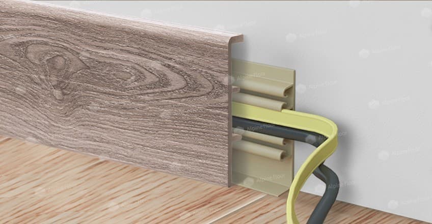 Монтаж происходит на монтажные клипсы. При монтаже плинтус запиливают под углом под 45 градусов, что позволяет сделать стыковку плинтуса практически незаметной.